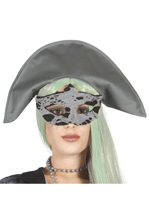 Incluye un fantasmagórico antifaz de pirata zombie negro y gris.