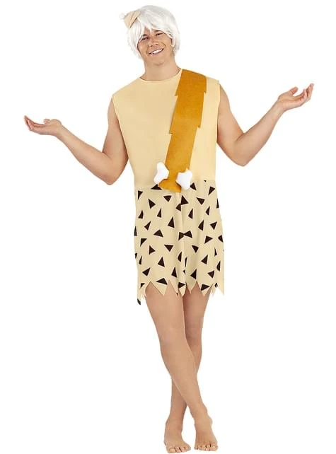 Este es el traje oficial de Bam-Bam de Los Picapiedra, por lo que no le falta detalle. Este disfraz de Bam-Bam para hombre incluye una túnica corta sin mangas, acabada en picos y con estampado de triángulos negros en la parte inferior. Además incluye un hueso colgado en la parte del torso, algo característico del atuendo de Bam-Bam. No puede faltar una peluca blanca con el pelo corto, seña de identidad del pequeño de los Mármol.
