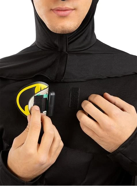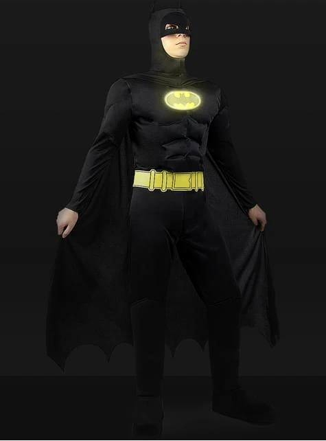 Incluye: Mono músculoso, dispositivo de luz en el logo, cinturón, cubrebotas y capa con pasamontañas