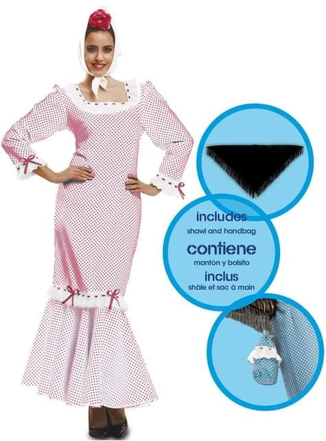 Incluye: vestido, pañuelo cabeza, bolsito y mantón