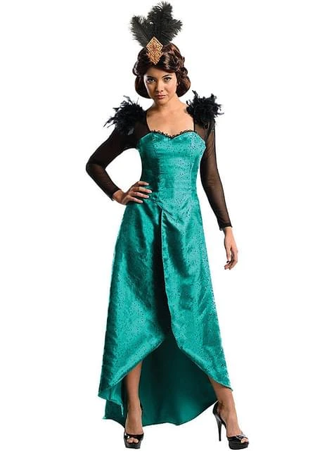 Este impresionante disfraz de Evanora incluye un precioso y largo vestido verde , con mangas de tul de color negro, y plumas en los hombros. Además, incorpora una magnífica diadema con plumas negras.