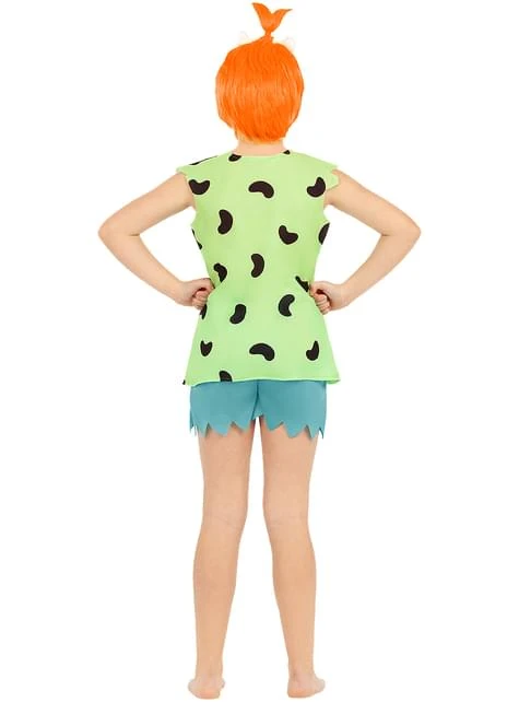 Este vestido de Pebbles para niña cuenta con todos los detalles que le hacen ser idéntico al atuendo de la pequeña de la familia Picapiedra. El disfraz de Pebbles se compone de una camiseta verde sin mangas con manchitas negras en forma de cacahuete y un pantalón corto azul claro. Además, incorpora una peluca naranja con flequillo y coleta puntiaguda aguantada por un hueso.