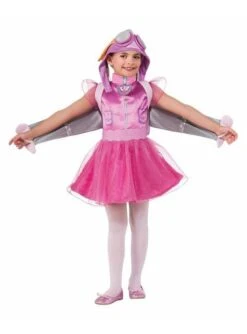 Este disfraz de Sky se compone de un vestido de manga corta, con la parte superior formada por un chaleco de aviadora fucsia y la parte inferior por una falda rosa. Además, incluye una mochila rosa con alas incluidas y una gorra con gafas de aviador y orejas de perro.