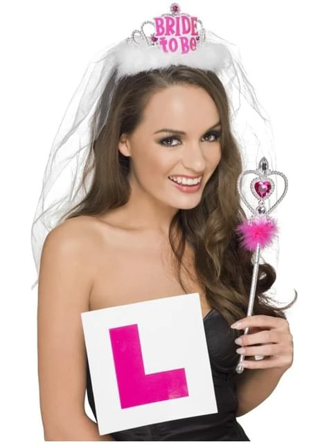 Incluye una tiara con velo, una varita de corazón y un cartel con la L.