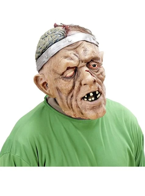Incluye una máscara de abuelo con medio cerebro al descubierto, cicatrices y pelo en la cabeza y cara de moribundo.