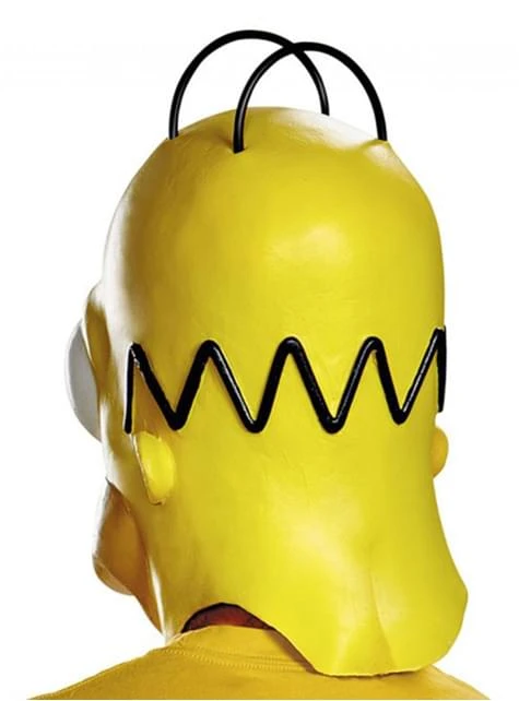 Incluye una impresionante máscara de Homer Simpson, de vinilo de color amarillo y con los ojos grandes y blancos.