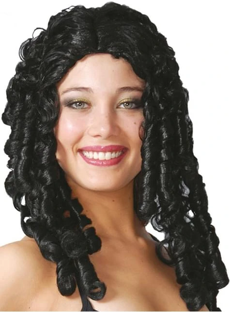 Incluye una peluca negra con tirabuzones y la raya en medio.