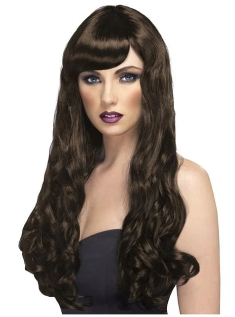 Incluye una peluca larga, rizada y con flequillo de color marrón.