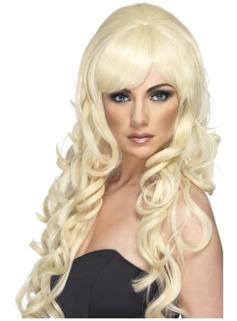 Incluye una peluca larga y ondulada de color rubio y con flequillo.