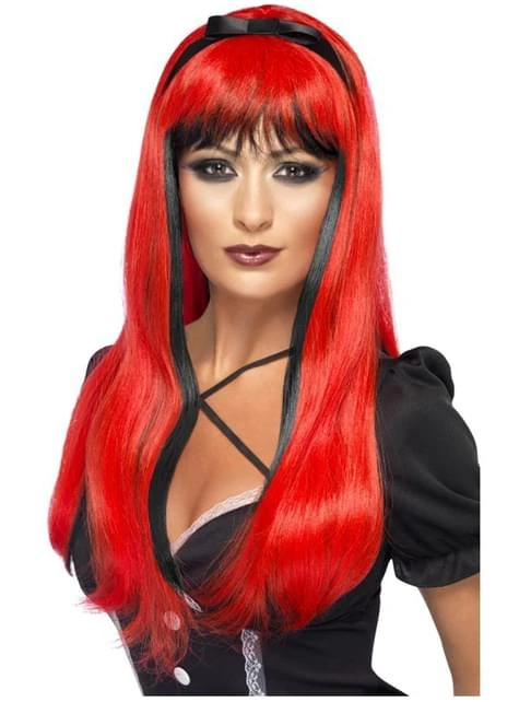Incluye una peluca larga y lisa con flequillo de color rojo sobre negro.