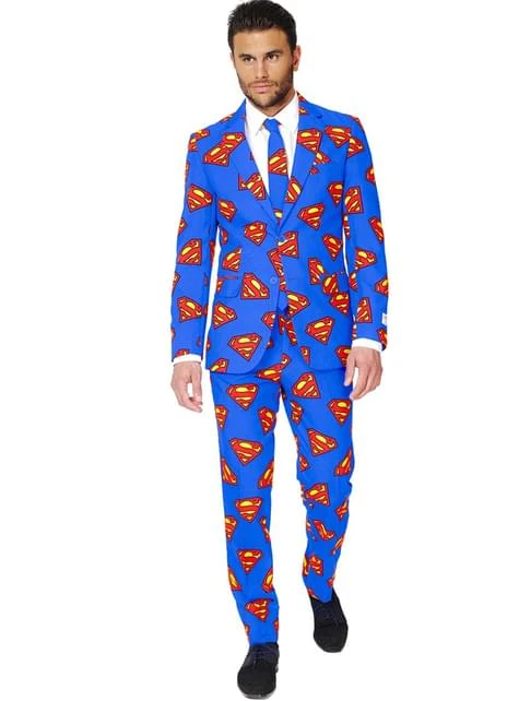 ¿Quieres ser un superhéroe sin perder la elegancia? Con este traje de Superman Opposuits serás el superhéroe con más porte de la fiesta. Incluye un traje azul estampado con el logotipo de Superman en la chaqueta, pantalón y corbata.